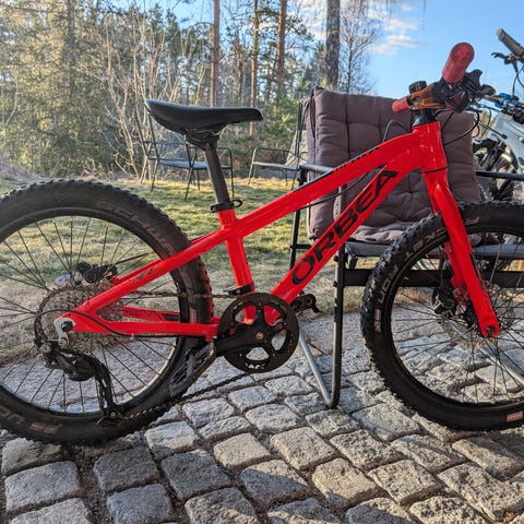 Trek Roscoe barnesykkel med 24" hjul. Sykkelen har rød/oransje ramme med sorte detaljer. Fatbike / trail med grove dekk som gir godt grep i terrenget. Passer for barn som trenger en terrengorientert sykkel i 24" størrelse til sykling på vei, grus og enkle stier.