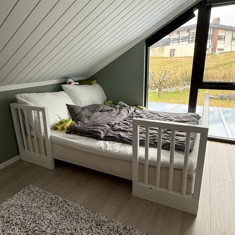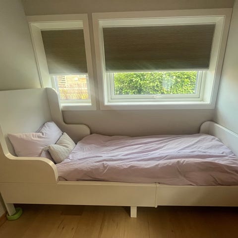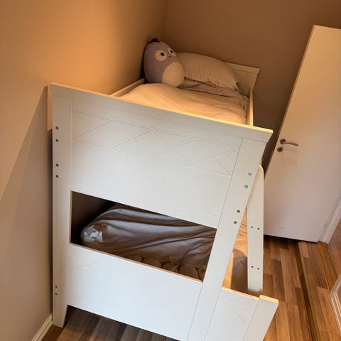To barnesenger gis bort, sammen. Den ene har en ende med klistermerker som kan setter mot ett hjørne for å skjule dem. De mangler også en sengebunn som er lett å lage selv. Madrass følger med. Barneseng egnet for barn som har vokst ut av sprinkelseng. Sengen har klassisk utforming med hode- og fotende, og passer inn på barnerom eller gjesterom.