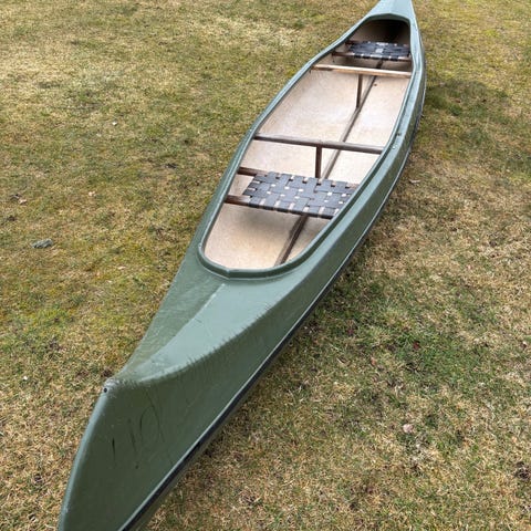 Selger en kano støpt i glassfiber.