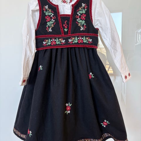 Bilder viser bruksmerker. Vanlig hvit strømebukse følger med, den er kun brukt til bunaden og har fått seg noen svarte nupper (se bilde)