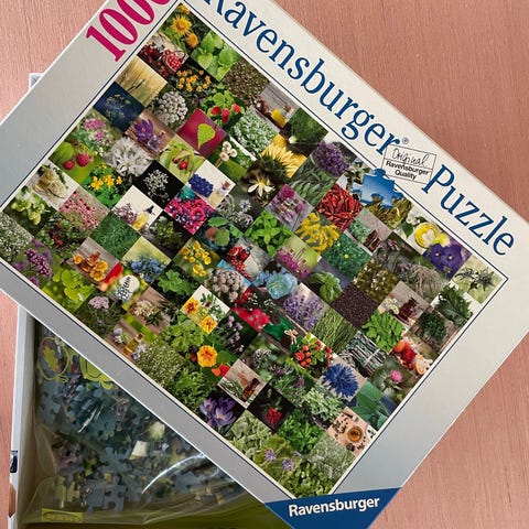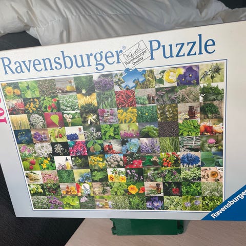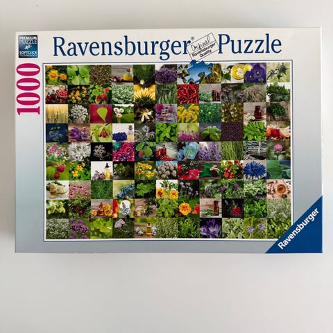 Ravensburger puslespill motiv blomster, tog i fjellandskap og interiør