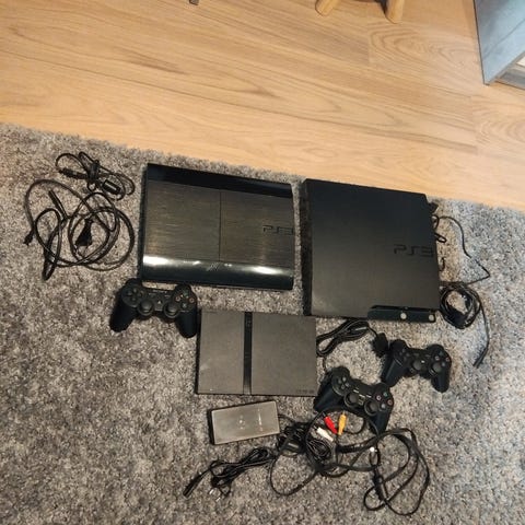 Konsollen er en Playstation 3-modell fra Sony. På bildene følger det med strømkabel og tilkoblingskabler. I tillegg vises flere PS3-spill, blant annet fotballspill og action-/eventyrspill.