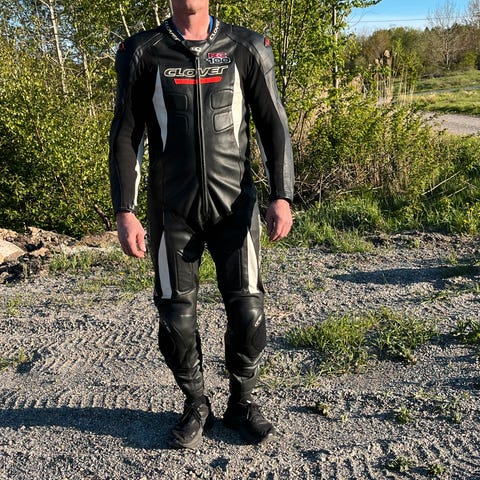 MC kjøredress i tekstil for herre. Str L jakke og M bukse. Dressen består av jakke og bukse i grå/svart farge med flere paneler og forsterkninger. Jakken har høy krage, frontglidelås og flere lommer. Buksen har justeringer i livet og ved bena, samt glidelåser og lommer. Dressen er vind og vanntett og har avtagbart for på innsiden.