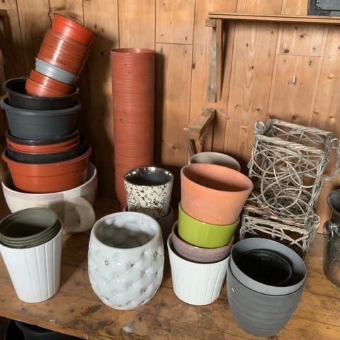 En vase og tre blomsterpotter gis bort samlet. Må hentes snarest på Tasta.