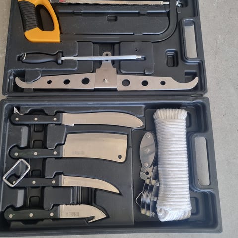 Pent knivsett fra Mustad med skjærebrett som pakkes praktisk som koffert så det kan medbringes på tur.