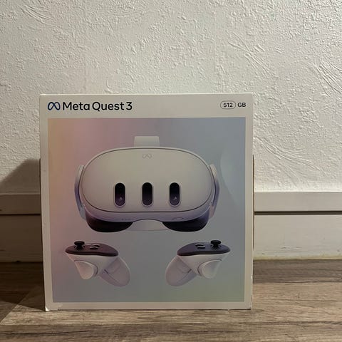 Meta Quest 3 VR-headsett med 512 GB lagringskapasitet i hvit farge. Headsettet leveres med to håndkontrollere og lader. Har ikke brukt mer enn 5 ganger.