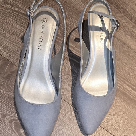 H&M hæler i slingback-modell i størrelse 42. Skoene er røde og har spiss tå og lav hæl. Overdel i polyester med elastisk stropp bak hælen. Fôret er i polyester, og yttersålen er i termoplastisk gummi (TPR). Passer som pene sko til bruk ved ulike anledninger.