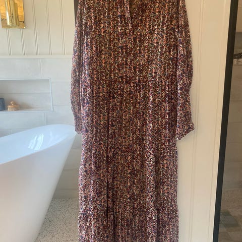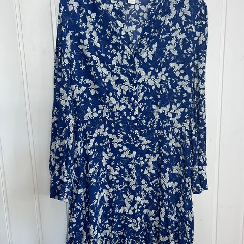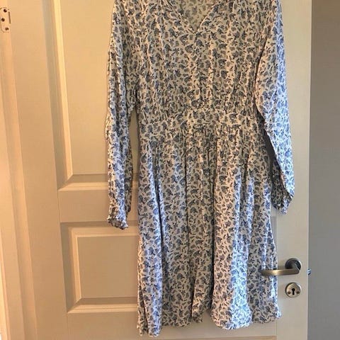 Moss Copenhagen sommerkjole for dame i størrelse L. Kjolen er flerfarget med blomsterprint i hovedsak blå og lyse toner. Den er laget i viskose og har lange ermer, v-utringning og innsnitt i midjen for en lett innsvinget fasong. Passer til hverdagsbruk og lette sommeranledninger.