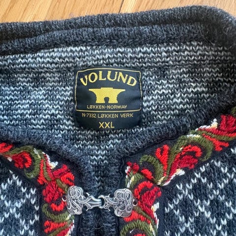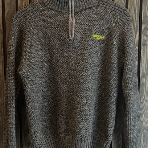 Norheim ullgenser for herre i størrelse XXL. Genseren er grønn med grovstrikket struktur og høy krage i kontrastfarge med glidelås i halsen. Laget i ull, egnet som mellomlag eller ytterplagg i kjøligere vær. Langermet modell med ribbestrikkede avslutninger på ermer og nederkant.
