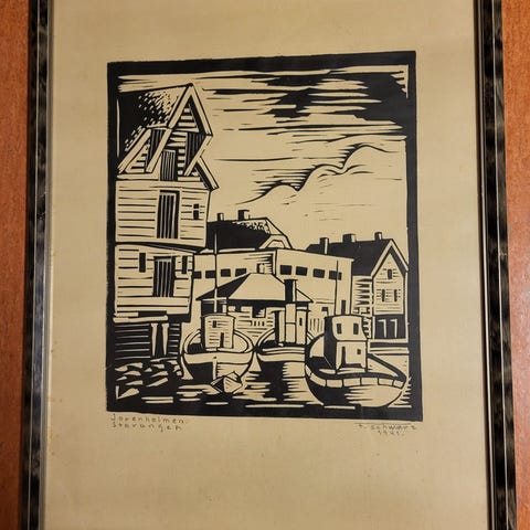 Rynning: grafisk trykk motiv fra Bakklandet, , Trondheim, innrammet
