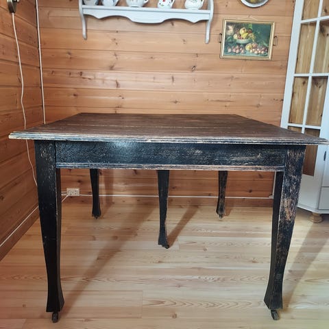 Solid gammelt spisebord. Bordplate i brunlakkert tre og understell i heltre med søylefot.