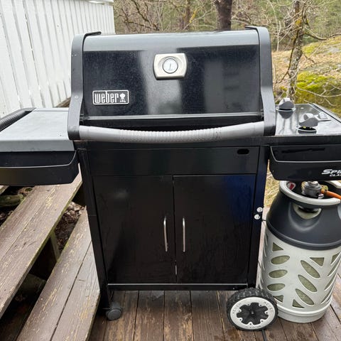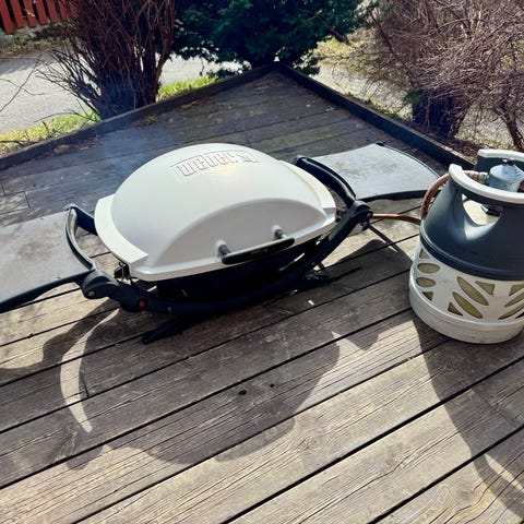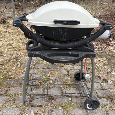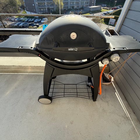 Weber Q gassgrill med stativ i svart og hvit. Den er fra 2010, men har stått lagret på en utleieenhet og neppe vært brukt mer enn et titalls ganger. Tenner fungerer, noe som er krøss i taket for brukte griller.