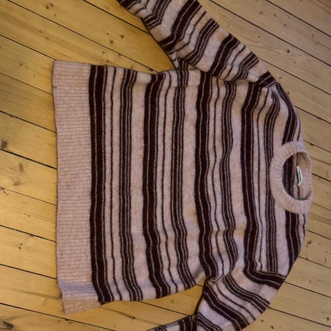 Holzweiler genser for dame i størrelse L. Genseren er strikket i ull og har en beige farge. Modellen har rund hals, lange ermer og en avslappet passform. Strukturen i strikken gir et grovt, mykt uttrykk. Passer til hverdagsbruk og kan kombineres med både bukser og skjørt.