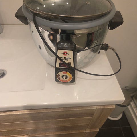 Sett med utstyr til hjemmebrygging av øl. Inneholder stor metallkjele med lokk og tappekran, plastgjæringskar med lokk og gjærlås, spiralkjøler i metall for nedkjøling av vørter, samt rødt flaskestativ for tørking og lagring av flasker. Egner seg til brygging av øl eller andre gjærede drikker i mindre skala hjemme. Flere beholdere og slanger for omstikking og tapping følger også med, slik at man kan gjennomføre hele bryggeprosessen fra koking til gjæring og tapping på flaske.