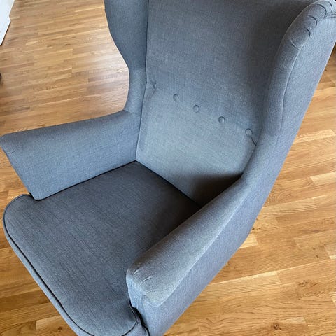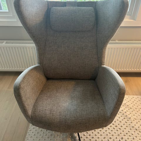 Pent brukt stol med puff selges. Bredde rygg 95cm, bredde sittepute 90, sittehøyde 40cm.