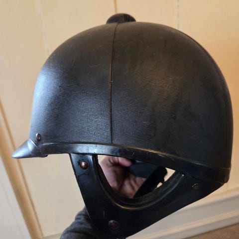 Equi-Guard Olympic Rider ridehjelm i svart farge. Hjelmen har klassisk skjerm og innvendig polstring. Merkelapp med modellnavn Olympic Rider. Størrelse er merket 50-51 på innsiden.