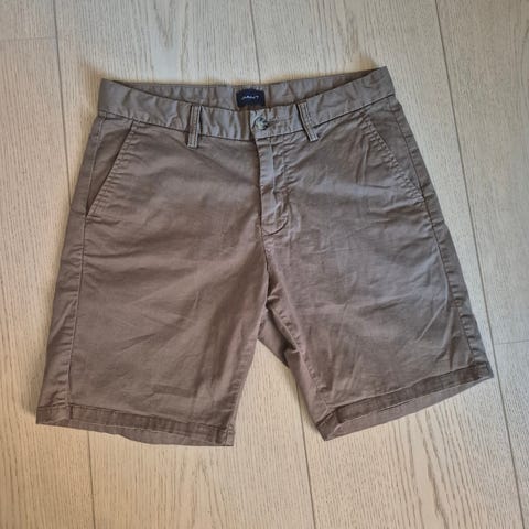 Gant shorts for herre i størrelse M (W35). Shortsen er beige og laget av bomull. Modellen har smal passform (slim) med skrålommer foran og knappelommer bak. Egnet til hverdagsbruk i varme perioder. Brukt en gang.