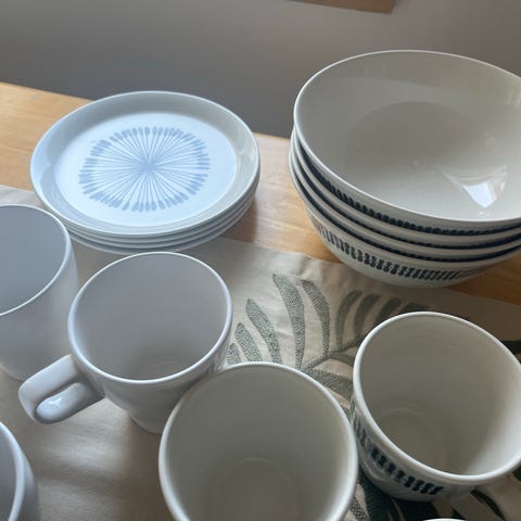 IKEA servise bestående av tallerkener, dype tallerkener/skåler og kopper med asjetter i blå keramikk.