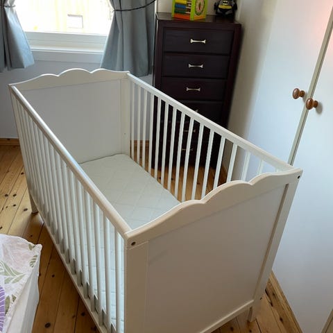 IKEA Hensvik sprinkelseng i hvit utførelse. Sengen har klassisk design med sprosser på langsidene og hel gavl i hode- og fotende. Passer til standard madrass for sprinkelseng, med anbefalt maksimal madrasshøyde på 120 mm i henhold til produsentens merking. Egnet som seng til baby og småbarn. Laget for innendørs bruk på barnerom eller soverom.