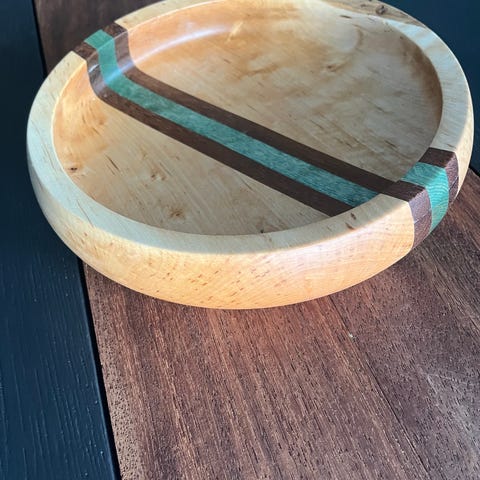 Meget pent håndlaget dreid trefat i lyst treverk med dekorert kant. Skålen har rund form med glatt innside og utskåret mønster langs kanten. Egnet som serveringsfat for frukt, nøtter etc Undersiden er merket med initialer til håndverkeren. Diameter 29 cm, høyde 6,5cm