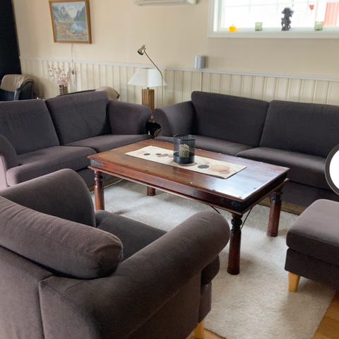 Selger også lenestolen med puff, også fra Brunstad, teppet og bordet. Ta kontakt dersom du ønsker en samlet pris for alt. Oppgitt pris er kun for sofa.