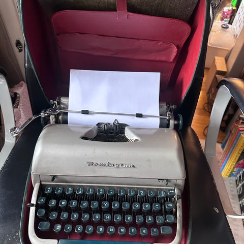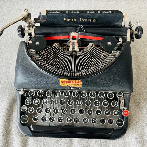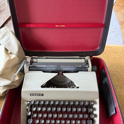 Rheinmetall bærbar skrivemaskin i grå farge. Mekanisk skrivemaskin med tastatur for norsk/tysk layout (blant annet Æ, Ø og Ü). Leveres i original bære- og oppbevaringskoffert. Håndtak har vært ødelagt ob ble erstatte av hyssing. Har vært oppbevart på loftet og koffert viser tegn på slitasje. Egner seg til skriving, notater, men trenger rensing for optimal bruk. fungerer som innrednings- og samlerobjekt. Skrivemaskinen har klassisk retrodesign med metallhus og manuell papirmating. Veier rett under 10kg. Pris sendes til leger uten grenser