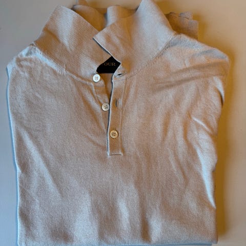 Dressmann genser for herre i størrelse S. Genseren er beige og laget i bomull. Den har lange ermer, ribbestrikkede kanter og v-hals med krage. Passer til hverdagsbruk.