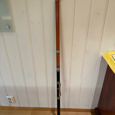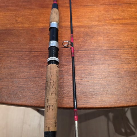 Dette er en eldre glassfiberstang med ekte retropreg, og et fint objekt både for samlere og for den som vil fiske med klassisk utstyr. Stangen fremstår hel og komplett på bildene, med original etikett og tydelig modellmerking.[fiskersiden +1]