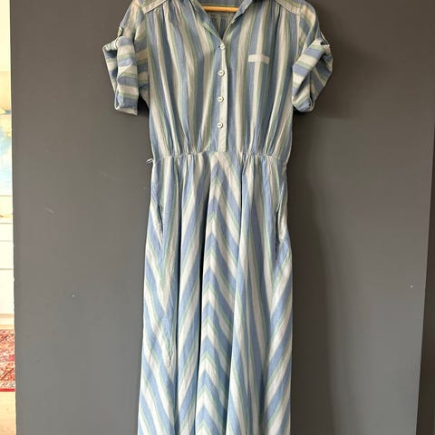 Kjolen er ermeløs med rund hals og har et flerfarget mønster i buer i blant annet lilla, blå, grønn, oransje og rosa toner. Den har knappelukking foran og er lett utsvingt i fasongen. Egner seg som sommerkjole eller lett hverdagskjole i varmere vær.