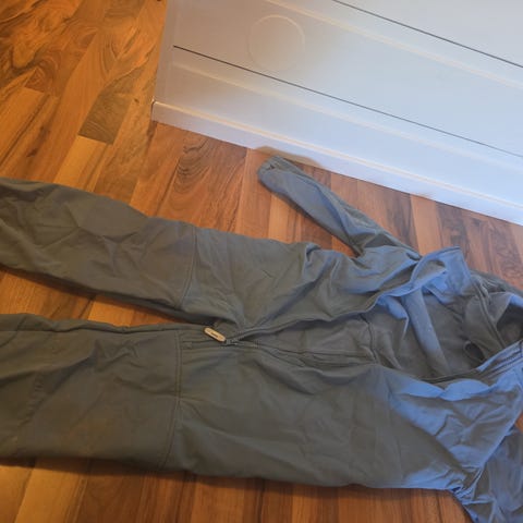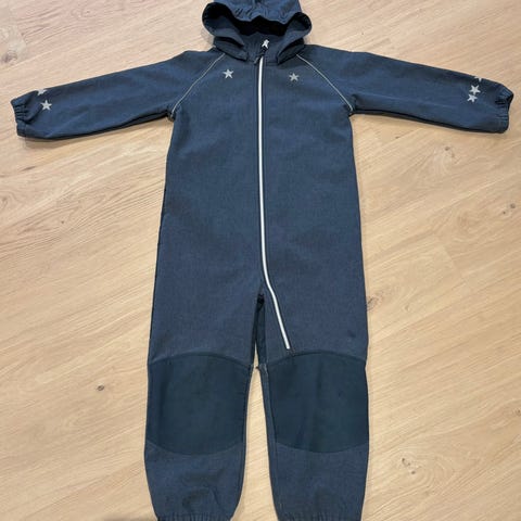 Name it heldress for gutt i størrelse 110. Dressen er blå med mønster og har hette. Forsterkede felt på knær og bak gir ekstra slitestyrke. Elastikk nederst på bena med fotstrikker for å holde dressen på plass. Glidelås foran for enkel av- og påkledning. Passer til hverdagsbruk og utelek. Trengs en vask