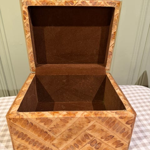 Selger en stilren designer inspirert dekorboks som kan brukes til oppbevaring av småting, smykker eller som pynt.