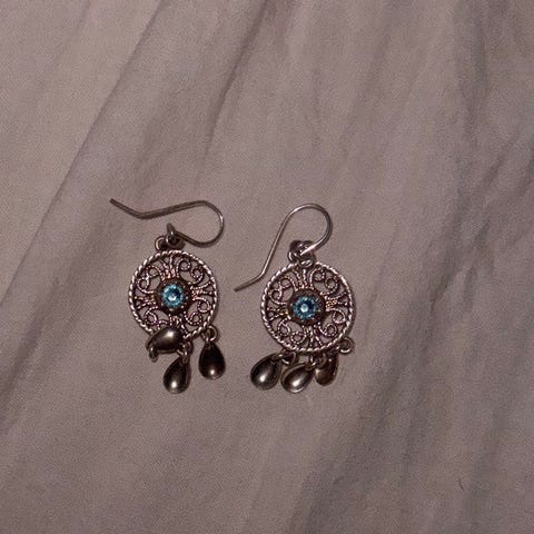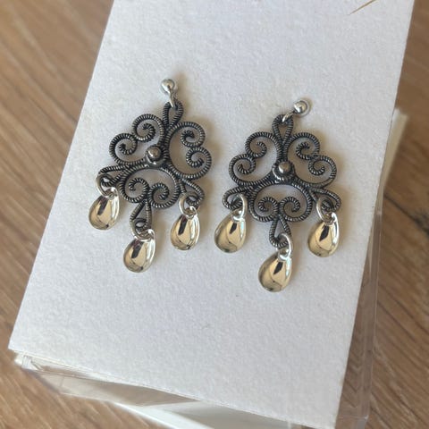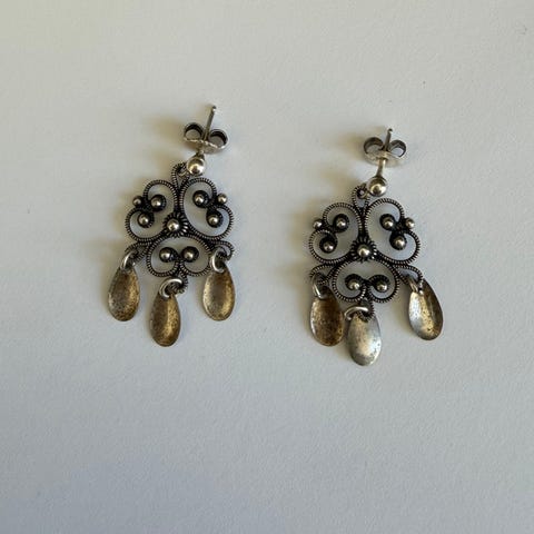 Pent brukte bunads øredobber i smykke eske formet som et skjell. Pris: 275,-