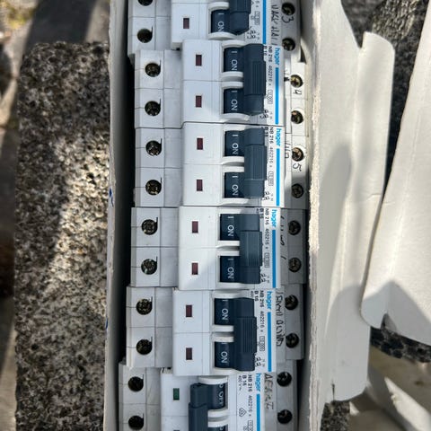 Gies bort mot henting i Arendal. Schneider Electric automatsikringer i hvit utførelse. Egnet for bruk i sikringsskap til fordeling og beskyttelse av elektriske kurser. Flere moduler vises på bildet, med både enkle og doble brytere. Passer for montering på DIN-skinne i standard sikringsskap. Nøyaktige spesifikasjoner som strømstyrke (A), kortslutningsvern og karakteristikk bør kontrolleres på merkingen på hver sikring før bruk.