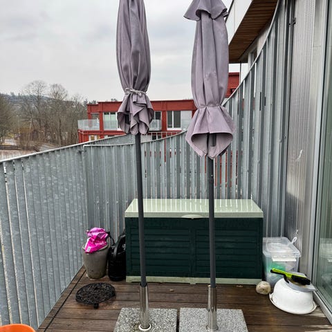 3,2x2,4 meter - med parasollføtter. Fungerer perfekt, ingen skader. 890,-