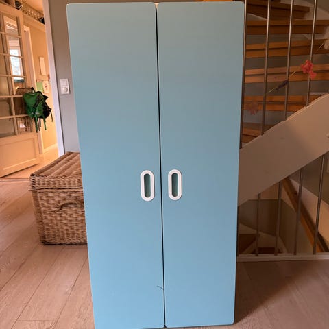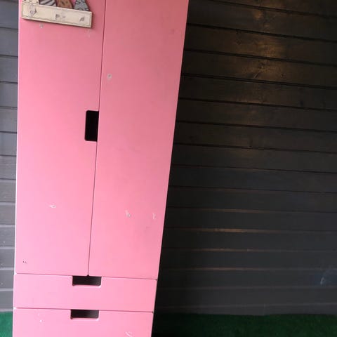 Funksjonelt og fint klesskap fra Ikea, merke Sannidal. Klesskapet står oppå en liten hylle, men det går fint an å separere skapet fra denne. Klistremerkene som er satt på skapet er veggklistremerker og det er fullt mulig å fjerne disse. Alternativt er dette et veldig søtt klesskap til en jente 🦄🌸