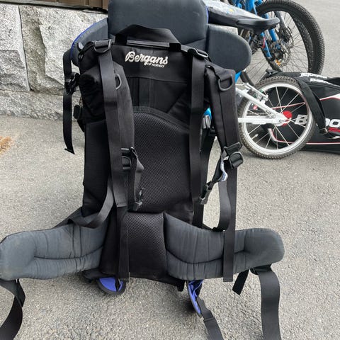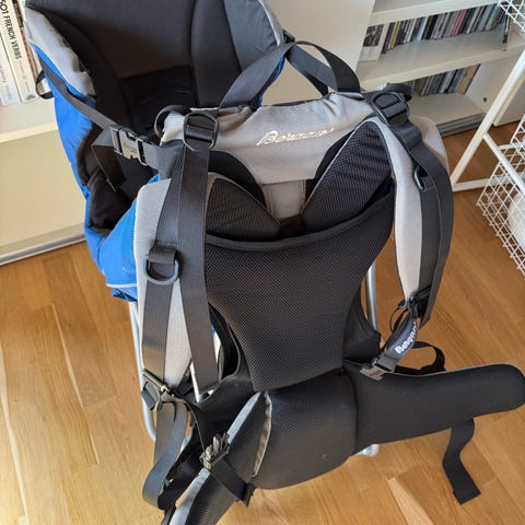 Bergans bæremeis i blå og svarte farger. Modellen har polstret hoftebelte og skulderstropper, justerbare reimer og støtteben slik at den kan stå stødig på bakken. Bæremeisen har integrert sol- og regnskjerm med gjennomsiktig frontparti, samt polstret sete og rygg for barnet. Egnet til å bære barn på tur og ved hverdagsbruk der det er behov for å frakte barnet på ryggen.