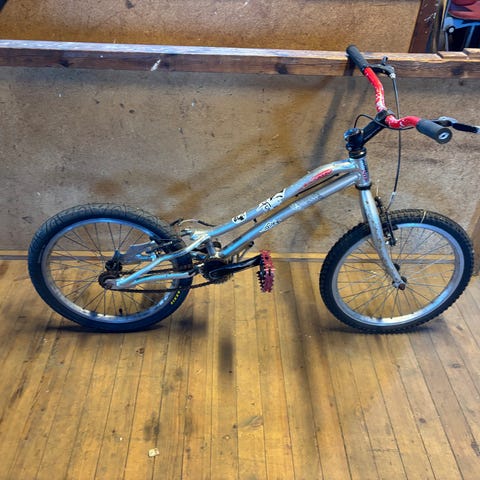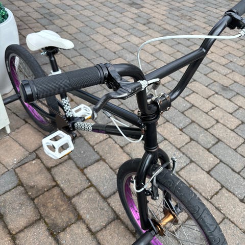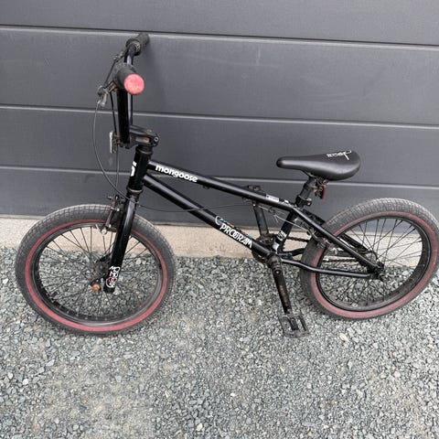 WeThePeople triksesykkel/BMX. Sykkelen er godt brukt, men har mye bruk igjen. Er bruksmerker, litt smårust og malingssøl på den. Selges derfor billig. Usikker på rammestr og hjulstr, men se bilder for mål i cm.