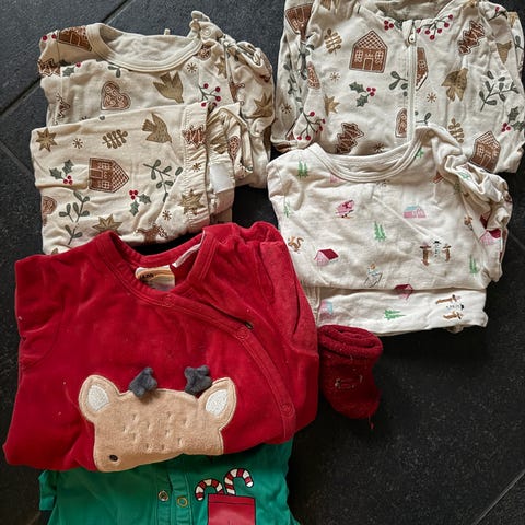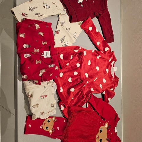 Julepakke, med 2 pysjer, 2 gensere, 2 sett med body og bukse (det ene settet har en lue til), og en en separat bukse og body. Selges kun samlet.