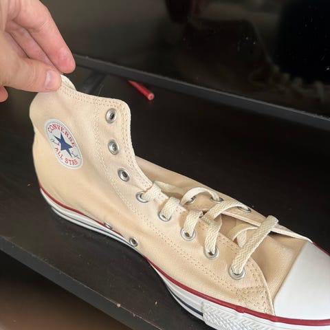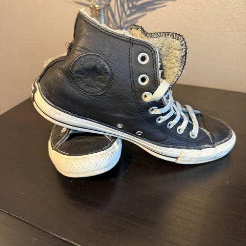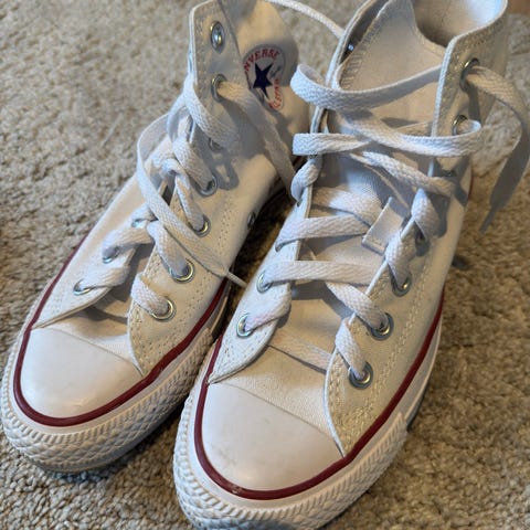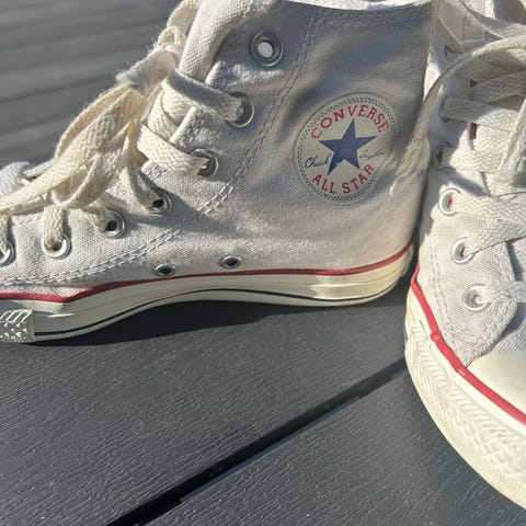 Converse Chuck Taylor All Star sneakers i størrelse 41. Klassiske høye canvas-sko med gummisåle og snøring. Farge: hvit med karakteristiske Converse-detaljer på side og hæl. Passer som fritidssko til hverdagsbruk.