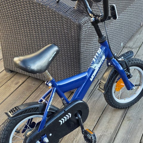 Barnesykkel 12". Den er utstyrt med støttehjul som kan monteres av og på etter behov, samt skjermer foran og bak. Det følger også med en blå sykkelhjelm og en sykkelstang/push pole.