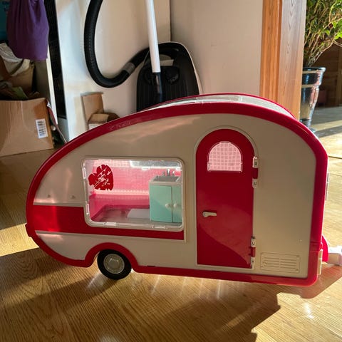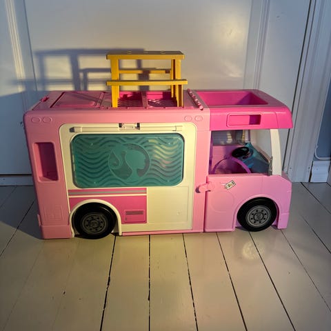 Barbie bobil lekesett i rosa plast. Settet består av bobil med avtagbar bil foran, innredning med kjøkken, sitteplasser og bad med dusjforheng. I tillegg følger det med flere små tilbehør som stoler, bord, servise, matrelaterte deler og andre smådeler til lek inne og utenfor bobilen. Bobilen kan åpnes opp for å gi tilgang til innredningen, og det er egen plass til basseng og liten båt.