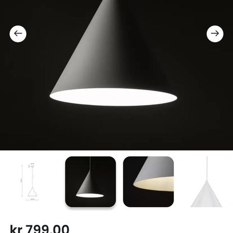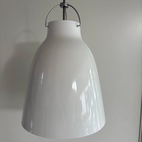 Fritz Hansen Caravaggio P3 taklampe i svart. 40 cm i diameter. Pendellampen har en skjerm med blank utside og lys innside som gir nedadrettet lys. Opphenget består av metallbøyler og tekstilkledd ledning. Egnet som belysning over spisebord eller kjøkkenøy. Bruker standard lyspære med stor sokkel. Ligger ute ny for 7350 kr nå. Jeg fant ingen skader på skjermen. På ledningen er det slitasje øverst, men den kan skjules inne i sokkelen som følger med.