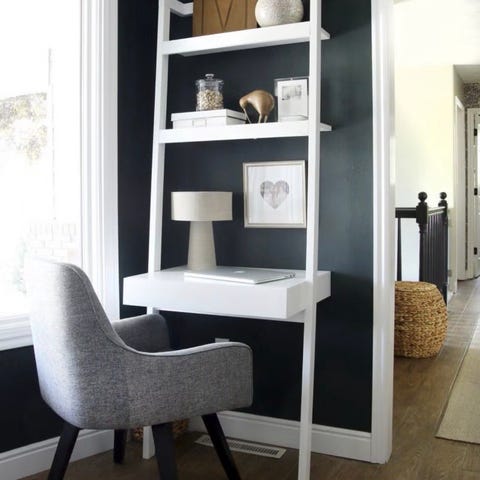 Fin vegghylle med veggskinner, 1 hylle og 1 skrivebordsdel. Den er i god stand.