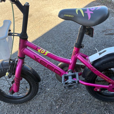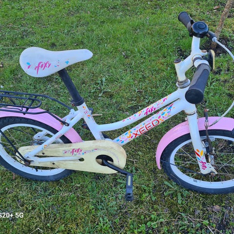 Xeed Foxy barnesykkel med 16" hjul i rosa farge. Sykkelen har flere bruksmerker, men er i god stand. Oppbevart tørt (i garasje) når den ikke har vært i bruk. Derav lite rust. Kurven forran er morken, men kan enkelt tas av. Sykkelen har bagasjebrett, og støtte.