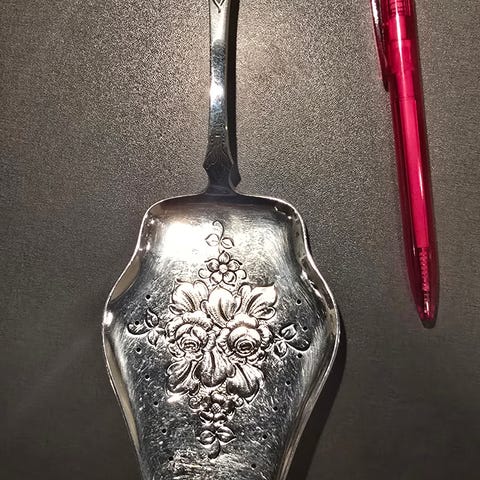Antikk fiskespade av Magnus Aase antagelig fra tidlig 1900 tallet. Motiv er ti speilvendte fisker som danner et hjerte i midten. Er produsert i 830 sølv. Er mulig å gi bud. Ikke skam bud da.