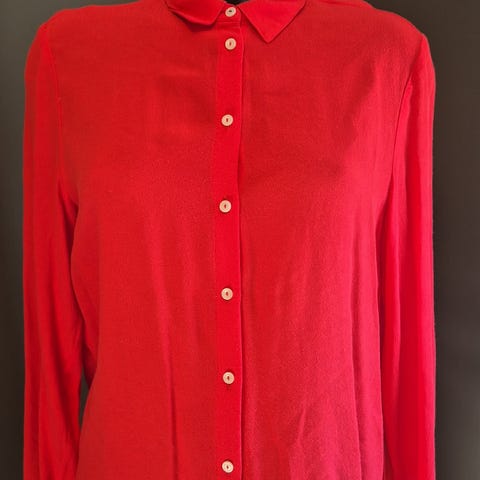 Blusen er lakserød farge og laget i polyester. Den har klassisk krage, lange ermer og knappelukking foran med skjult knappestolpe. Stoffet er lett og faller mykt, egnet til både hverdagsbruk og mer formelle anledninger.