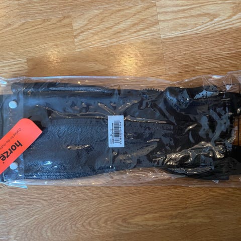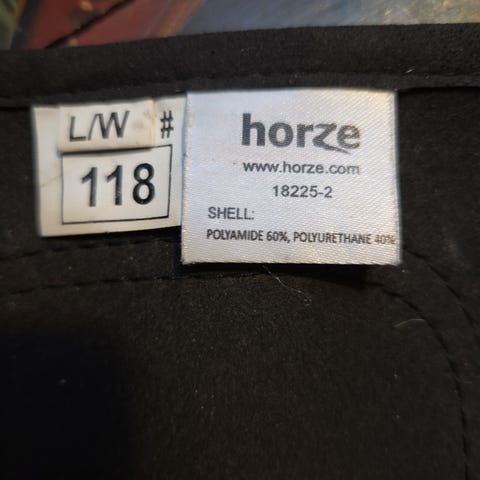 Ridechaps i svart farge. Modellen har glidelås bak, strikkfelt for bedre passform og stropp under foten. Egner seg til bruk utenpå korte ridesko eller jodhpurs for å gi bedre støtte og beskyttelse til leggen ved ridning. Brukt av 10 åring.