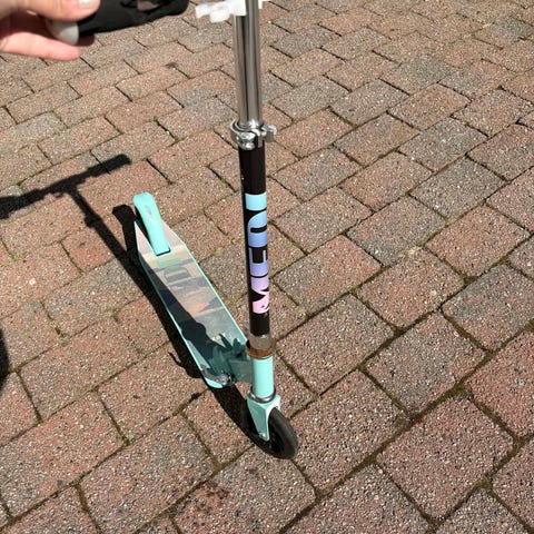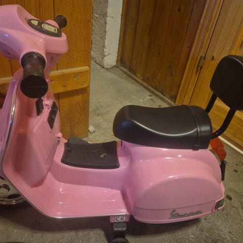 Løpesykkel utformet som en scooter for barn. Denne har tre hjul for økt stabilitet. Setet kan åpnes og gir et lite oppbevaringsrom under. Brukt innendørs.