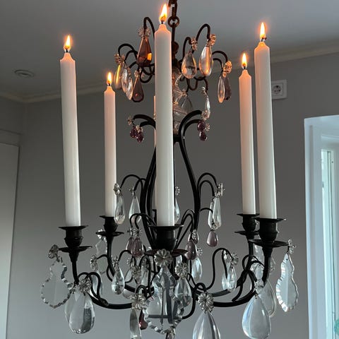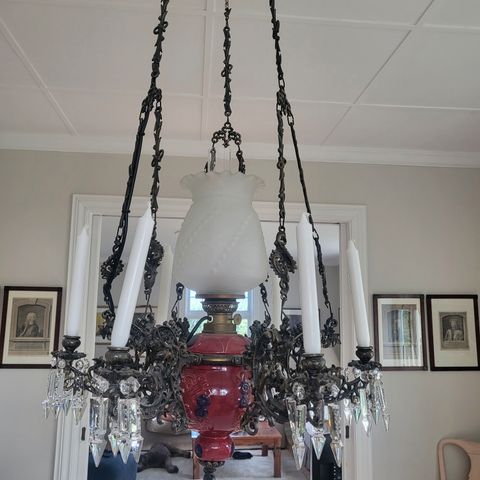 Gammel taklampe for både olje og stearinlys. Justerbar med underkant lampe varierende fra 113 cm. til 143 cm. under tak.