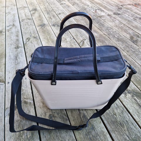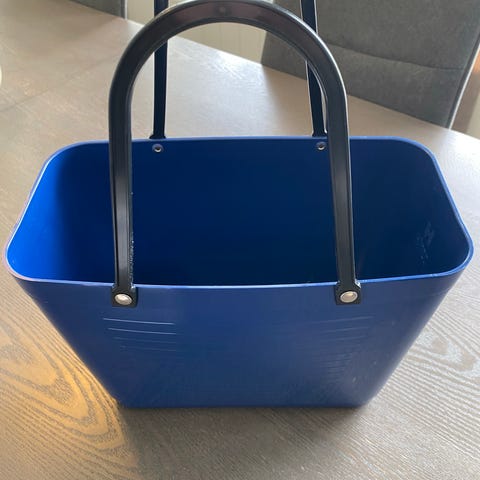 Stor veske fra Hinza i plastikk selges. Vesken er sort. Mål: 44cm lengde, 17cm bredde og 25cm høyde.